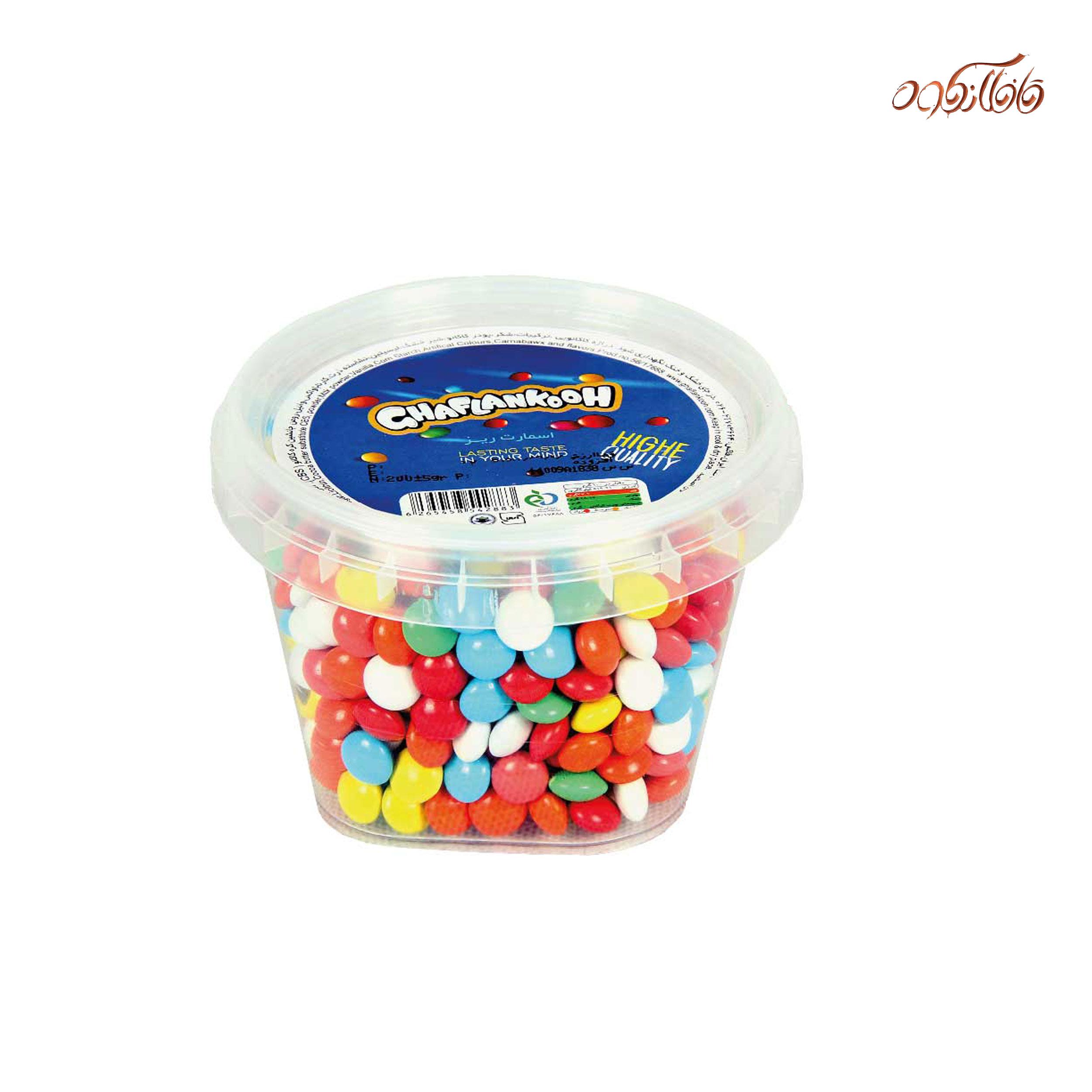 اسمارتیز سطلی کوچک قافلانکوه شامل 200 گرم اسمارتیز رنگی شکلاتی با رنگ مجاز خوراکی می باشد